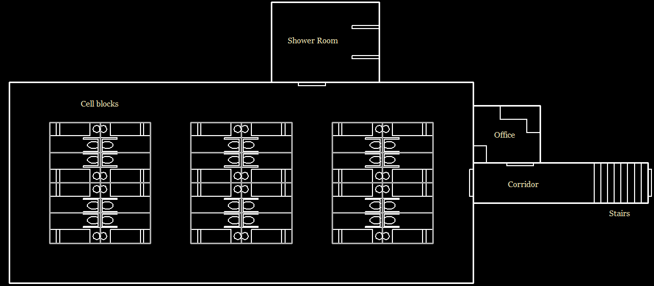 Block A is kept mostly empty to serve as an isolation block for those nearing parole, or for health or other reasons. When blocks B and C, the standard basement configuration, become full, more identical blocks can be added on through the Library's mutability. Currently block D is the latest in use.